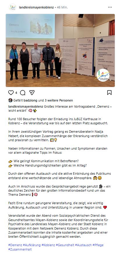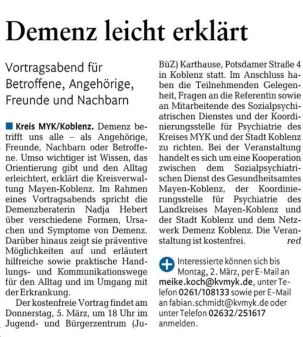 Kooperationsveranstaltung des Netzwerk Demenz Koblenz und der Koordinierungsstelle für Psychiatrie des Landkreises Mayen-Koblenz und der Stadt Koblenz sowie dem Sozialpsychiatrischen Dienst des Gesundheitsamtes Mayen- Koblenz.
